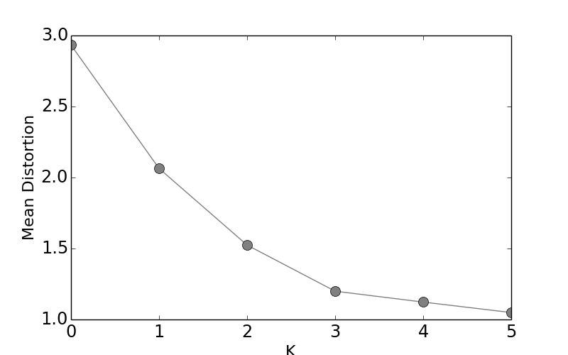 where we have chosen $K=4$. How do we choose the value of $K$? This is the eternal question of generalization versus approximation --- too many clusters provide great approximation but bad generalization. One way to approach this problem is to compute the mean distortion for increasingly larger values of $K$ until it no longer makes sense. To do this, we want to take every data point and compare it to the centers of all the clusters. Then, take the smallest value of this across all clusters and average those. This gives us an idea of the overall mean performance for the $K$ clusters. The following code computes this explicitly.