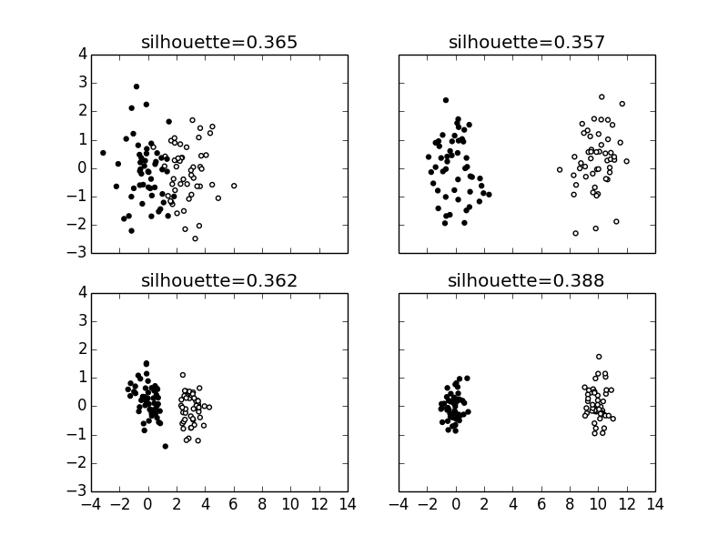 $$ \texttt{sc}_i = \frac{b_i-a_i}{\max(a_i,b_i)} $$The mean silhouette coefficient is just the mean of all these values over all the samples. The best value is one and the worst is negative one, with values near zero indicating overlapping clusters and negative values showing that samples have been incorrectly assigned to the wrong cluster. This figure-of-merit is implemented in Scikit-learn as in the following,