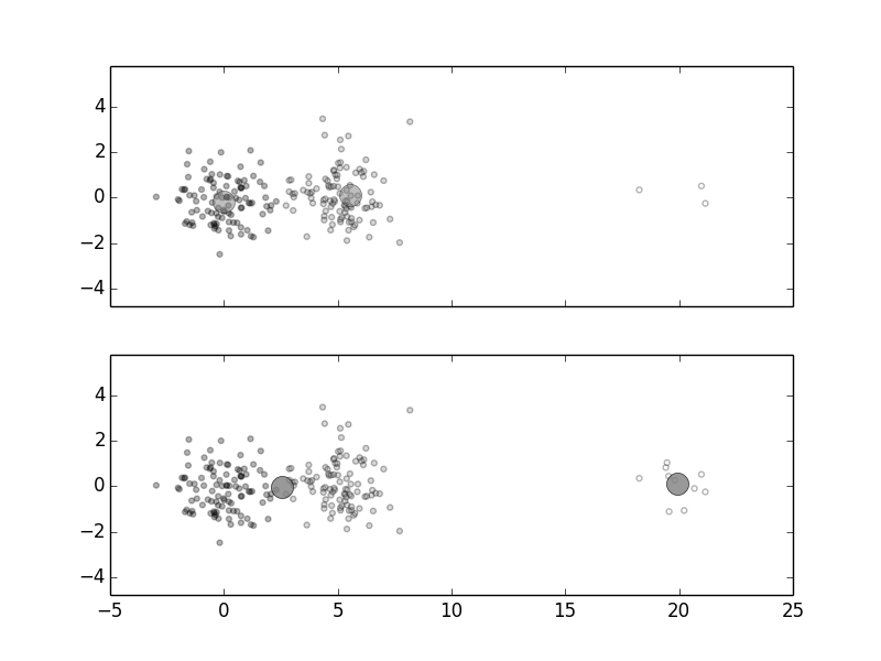 K-means is easy to understand and to implement, but can be sensitive to the initial choice of cluster-centers. The default initialization method in Scikit-learn uses a very effective and clever randomization to come up with the initial cluster-centers. Nonetheless, to see why initialization can cause instability with K-means, consider the following Figure, In Figure, there are two large clusters on the left and a very sparse cluster on the far right. The large circles at the centers are the cluster-centers that K-means found. Given $K=2$, how should the cluster-centers be chosen? Intuitively, the first two clusters should have their own cluster-center somewhere between them and the sparse cluster on the right should have its own cluster-center [^kmeans]. Why isn't this happening?