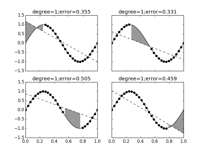 What if we had more than two points in the training data? What would happen to $\texttt{var}$ and $\texttt{bias}$? Certainly, the $\texttt{var}$ would decrease because it would be harder and harder to generate training data sets that would be substantially different from each other. The bias would also decrease because more points in the training data means better approximation of the sine function over the interval. What would happen if we changed the hypothesis set to include more complex polynomials? As we have already seen with our polynomial regression earlier in this chapter, we would see the same overall effect as here, but with relatively smaller absolute errors and the same edge effects we noted earlier. The corresponding Jupyter/IPython Notebook has the source code to help you can try these ideas and see for yourself.