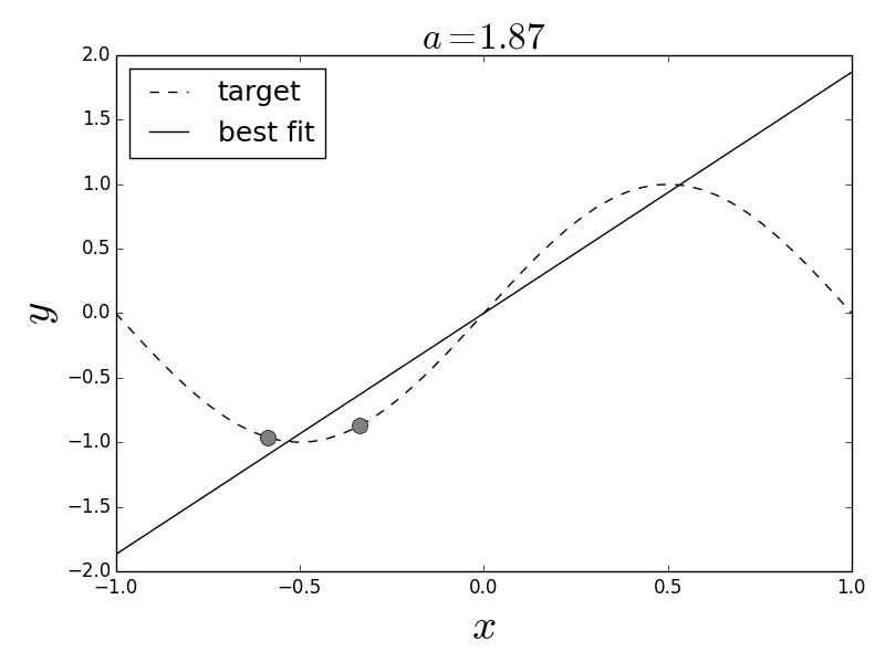 For a two-element training set consisting of the points shown, the line is the best fit over the hypothesis set, $h(x)=a x$.