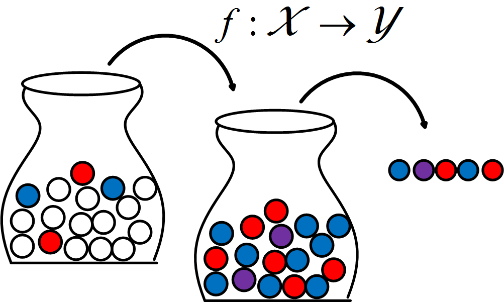 Let's consider the classic balls in urns problem (see Figure): we have an urn containing red and blue balls and we draw five balls from the urn, note the color of each ball, and then try to determine the proportion of red and blue balls in the urn. We have already studied many statistical methods for dealing with this problem in previous sections. Now, let's generalize the problem slightly. Suppose the urn is filled with white balls and there is some target unknown function $f$ that paints each selected ball either red or blue (see Figure). The machine learning problem is how to find the $f$ function, given only the observed red/blue balls. So far, this doesn't sound much different from the statistical problem. However, now we want to take our estimated $f$ function, say, $\hat{f}$, and use it to predict the next handful of balls from another urn. Now, here's where the story takes a sharp turn. Suppose the next urn already has some red and blue balls in it? Then, applying the function $f$ may result in purple balls which were not seen in the training data (see Figure). Now, what can we do? We have just scraped the surface of the issues machine learning must confront using methods that are not part of the statistics canon.