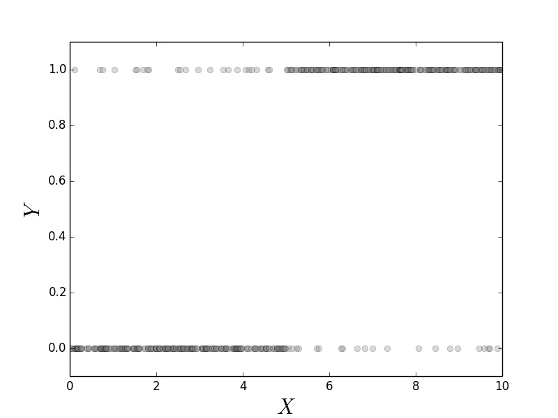 This scatterplot shows the binary $Y$ variables and the corresponding $x$ data for each category.