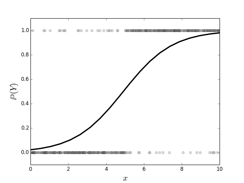 $$ \mathbb{P}(Y) = p^Y (1-p)^{ 1-Y } $$We also know how to solve the corresponding likelihood function for the maximum likelihood estimate of $p$ given observations of the output, $\lbrace Y_i \rbrace_{i=1}^n$. However, now we want to include other factors in our estimate of $p$. For example, suppose we observe not just the outcomes, but a corresponding continuous variable, $x$. That is, the observed data is now $\lbrace (x_i,Y_i) \rbrace_{i=1}^n$ How can we incorporate $x$ into our estimation of $p$?