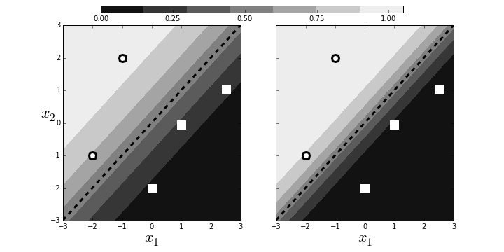 $$ \alpha\boldsymbol{\beta}^T \mathbf{x} = 0 $$describes the same hyperplane. This means that we can multiply $\boldsymbol{\beta}$ by an arbitrary scalar and still get the same geometry. However, because of $\exp(-\alpha\boldsymbol{\beta}^T \mathbf{x})$ in Equation eq:probbeta, this scaling determines the intensity of the probability attributed to $\mathbf{x}$. This is illustrated in Figure. The panel on the left shows two categories (squares/circles) split by the dotted line that is determined by $\boldsymbol{\beta}^T\mathbf{x}=0$. The background colors shows the probabilities assigned to points in the plane. The right panel shows that by scaling with $\alpha$, we can increase the probabilities of class membership for the given points, given the exact same geometry. The points near the boundary have lower probabilities because they could easily be on the opposite side. However, by scaling by $\alpha$, we can raise those probabilities to any desired level at the cost of driving the points further from the boundary closer to one. Why is this a problem? By driving the probabilities arbitrarily using $\alpha$, we can overemphasize the training set at the cost of out-of-sample data. That is, we may wind up insisting on emphatic class membership of yet unseen points that are close to the boundary that otherwise would have more equivocal probabilities (say, near $1/2$). Once again, this is another manifestation of bias/variance trade-off.