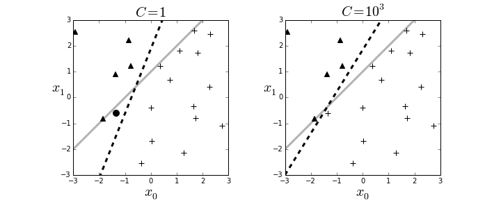 The resulting boundary is shown in the left panel in Figure. The crosses and triangles represent the two classes we created above, along with the separating gray line. The logistic regression fit produces the dotted black line. The dark circle is the point that logistic regression categorizes incorrectly. The regularization parameter is $C=1$ by default. Next, we can change the strength of the regularization parameter as in the following,