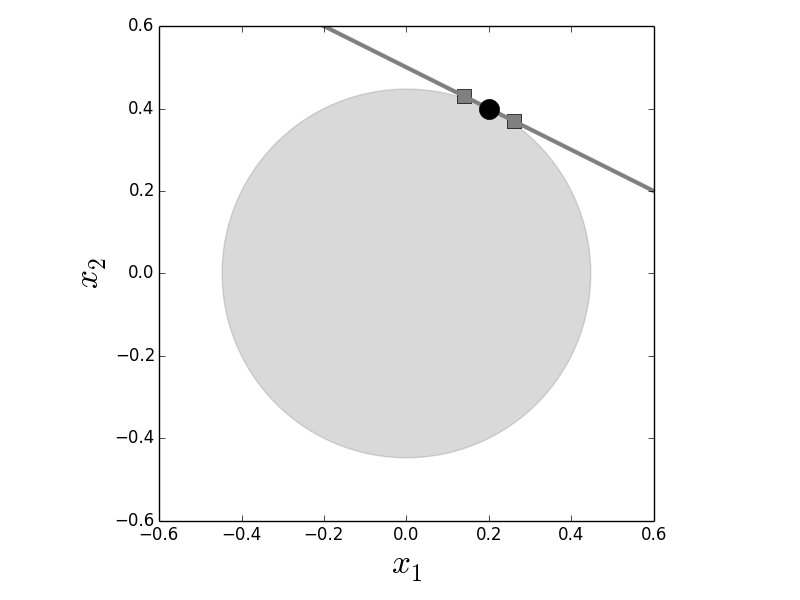 The solution of the constrained $L_2$ minimization problem is at the point where the constraint (dark line) intersects the $L_2$ ball (gray circle) centered at the origin. The point of intersection is indicated by the dark circle. The two neighboring squares indicate points on the line that are close to the solution.