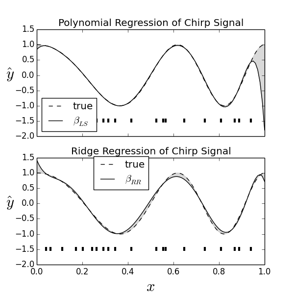 Let's see this in action with a familiar example from ch:stats:sec:nnreg. Consider Figure. For this example, we created our usual chirp signal and attempted to fit it with a high-dimensional polynomial, as we did in the section ch:ml:sec:cv. The lower panel is the same except with ridge regression. The shaded gray area is the space between the true signal and the approximant in both cases. The horizontal hash marks indicate the subset of $x_i$ values that each regressor was trained on. Thus, the training set represents a non-uniform sample of the underlying chirp waveform. The top panel shows the usual polynomial regression. Note that the regressor fits the given points extremely well, but fails at the endpoint. The ridge regressor misses many of the points in the middle, as indicated by the gray area, but does not overshoot at the ends as much as the plain polynomial regression. This is the basic trade-off for ridge regression. The Jupyter/IPython notebook has the code for this graph, but the main steps are shown in the following,