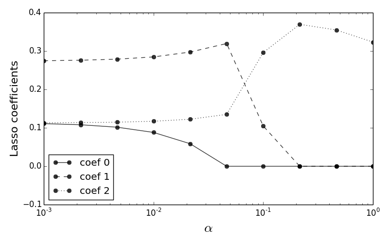 but one of the coefficients is driven to zero. Increasing $\alpha$