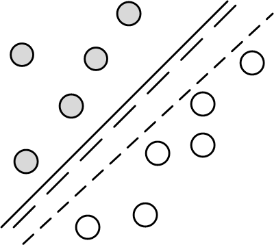 Support Vector Machines (SVM) originated from the statistical learning theory developed by Vapnik-Chervonenkis. As such, it represents a deep application of statistical theory that incorporates the VC dimension concepts we discussed in the first section. Let's start by looking at some pictures. Consider the two-dimensional classification problem shown in Figure. Figure shows two classes (gray and white circles) that can be separated by any of the lines shown. Specifically, any such separating line can be written as the locus of points ($\mathbf{x}$) in the two-dimensional plane that satisfy the following,
