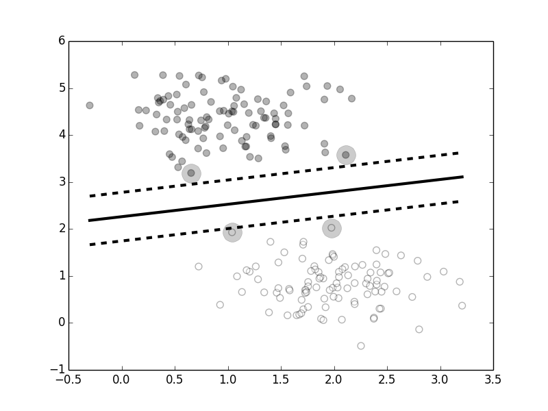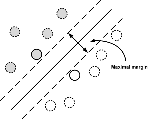 The two class shown (white and gray circles) are linearly separable. The maximal margin solution is shown by the dark black line in the middle. The dotted lines show the extent of the margin. The large circles indicate the support vectors for the maximal margin solution.