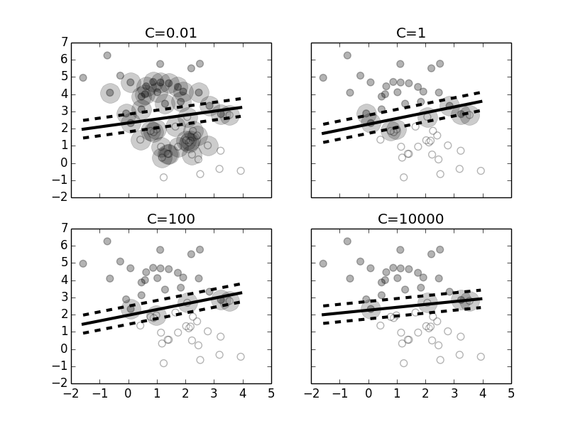 $$ \begin{equation} \begin{aligned} & \underset{\beta_0,\boldsymbol{\beta}}{\text{minimize}} & & \frac{1}{2}\lVert\boldsymbol{\beta}\rVert + C \sum \xi_i \\\ & \text{subject to:} & & y_i(\beta_0+\boldsymbol{\beta}^T \mathbf{x}_i) \geq 1-\xi_i, \xi_i \geq 0 \; i = 1, \ldots, N. \end{aligned} \end{equation} \label{eq:svm} \tag{1} $$Because the $\xi_i$ terms are all positive, the objective is to maximize the margin (i.e., minimize $\lVert\boldsymbol{\beta}\rVert$) while minimizing the proportional drift of the predictions to the wrong side of the margin (i.e., $C \sum \xi_i$). Thus, large values of $C$ shunt algorithmic focus towards the correctly classified points near the decision boundary and small values focus on further data. The value $C$ is a hyperparameter for the SVM.