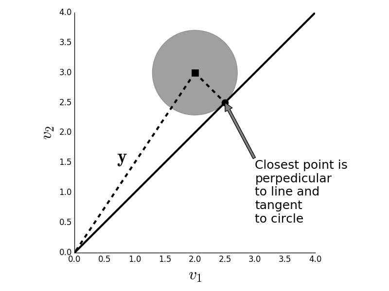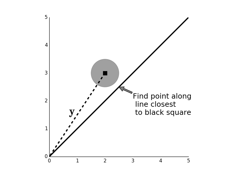 Given the point $\mathbf{y}$ (black square) we want to find the $\mathbf{x}$ along the line that is closest to it. The gray circle is the locus of points within a fixed distance from $\mathbf{y}$.