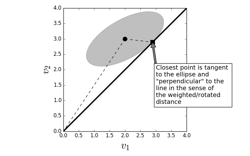 where $\mathbf{Q}$ is positive definite matrix. In the previous case, we started with a point $\mathbf{y}$ and inflated a circle centered at $\mathbf{y}$ until it just touched the line defined by $\mathbf{v}$ and this point was closest point on the line to $\mathbf{y}$. The same thing happens in the general case with a weighted distance except now we inflate an ellipse, not a circle, until the ellipse touches the line.