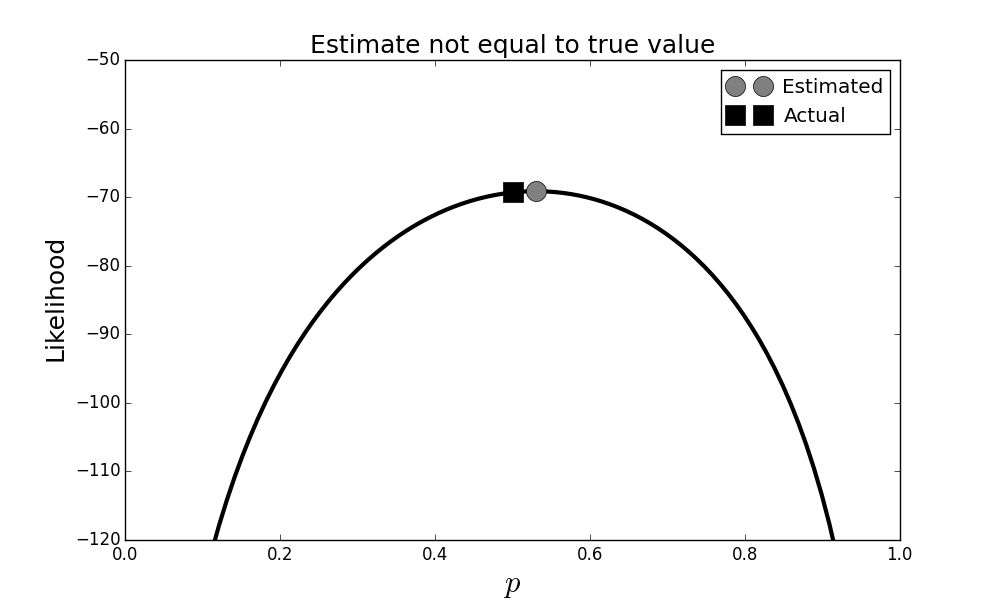 Figure shows that our estimator $\hat{p}$ (circle) is not equal to the true value of $p$ (square), despite being the maximum of the likelihood function. This may sound disturbing, but keep in mind this estimate is a function of the random data; and since that data can change, the ultimate estimate can likewise change. I invite you to run this code in the corresponding IPython notebook a few times to observe this. Remember that the estimator is a function of the data and is thus also a random variable, just like the data is. This means it has its own probability distribution with corresponding mean and variance. So, what we are observing is a consequence of that variance.